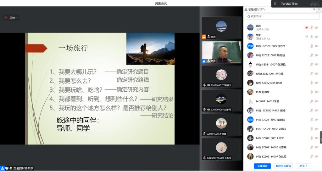 贾谊教授以一场旅行为切入点引出开题内容,将开题内容分为研究题目、研究路线和方法、研究内容三个方面。首先,贾谊教授提出从问题的来源、选题的原则、选题中容易出现的问题这几个方面来确定研究题目。其次,贾谊教授讲解了如何通过文献检索来确定研究路线和方法,鼓励大家大胆提出假设,还提出“要敢于批判前人的观点,勇于亮明自己的观点”。