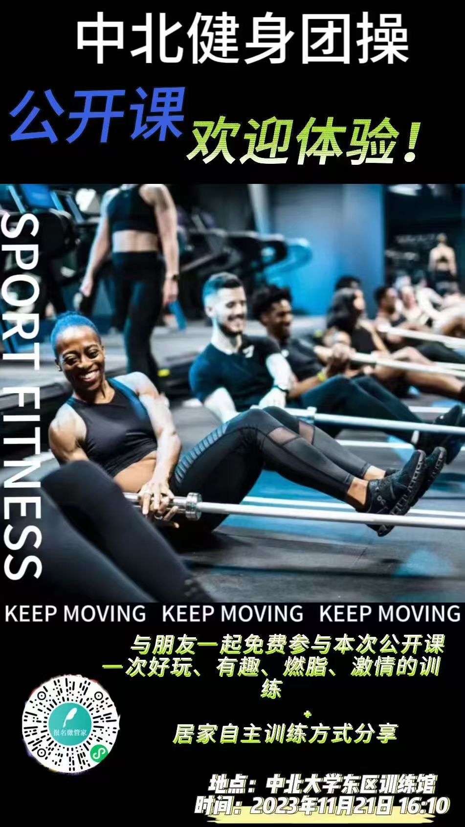 2023年11月21 日下午,一场备受瞩目的“中北健身团操公开课”在东区训练馆盛大举行。此次公开课邀请到了两位业内极具影响力的导师前来授课,为现场师生带来了一场精彩绝伦的健身知识与技能盛宴。