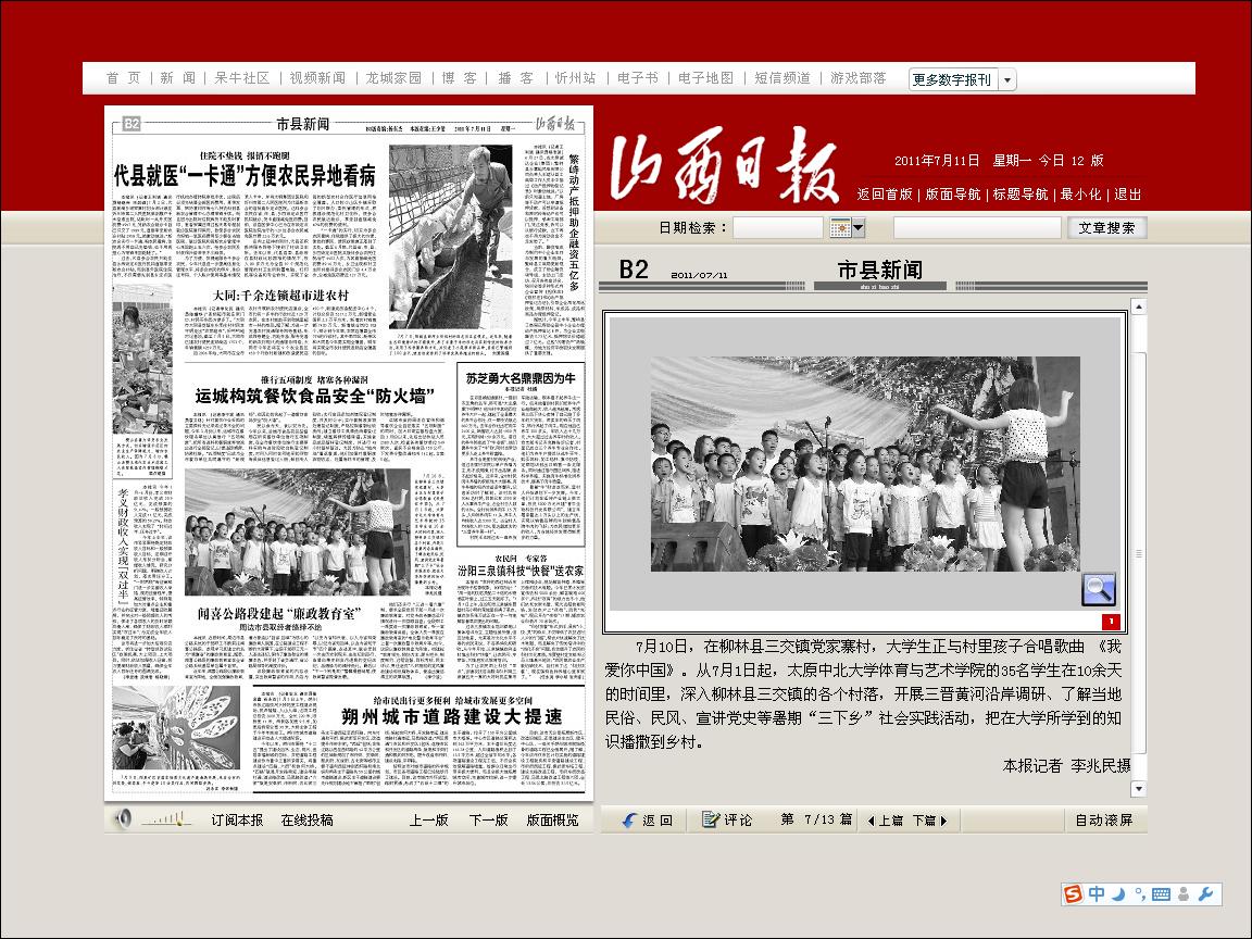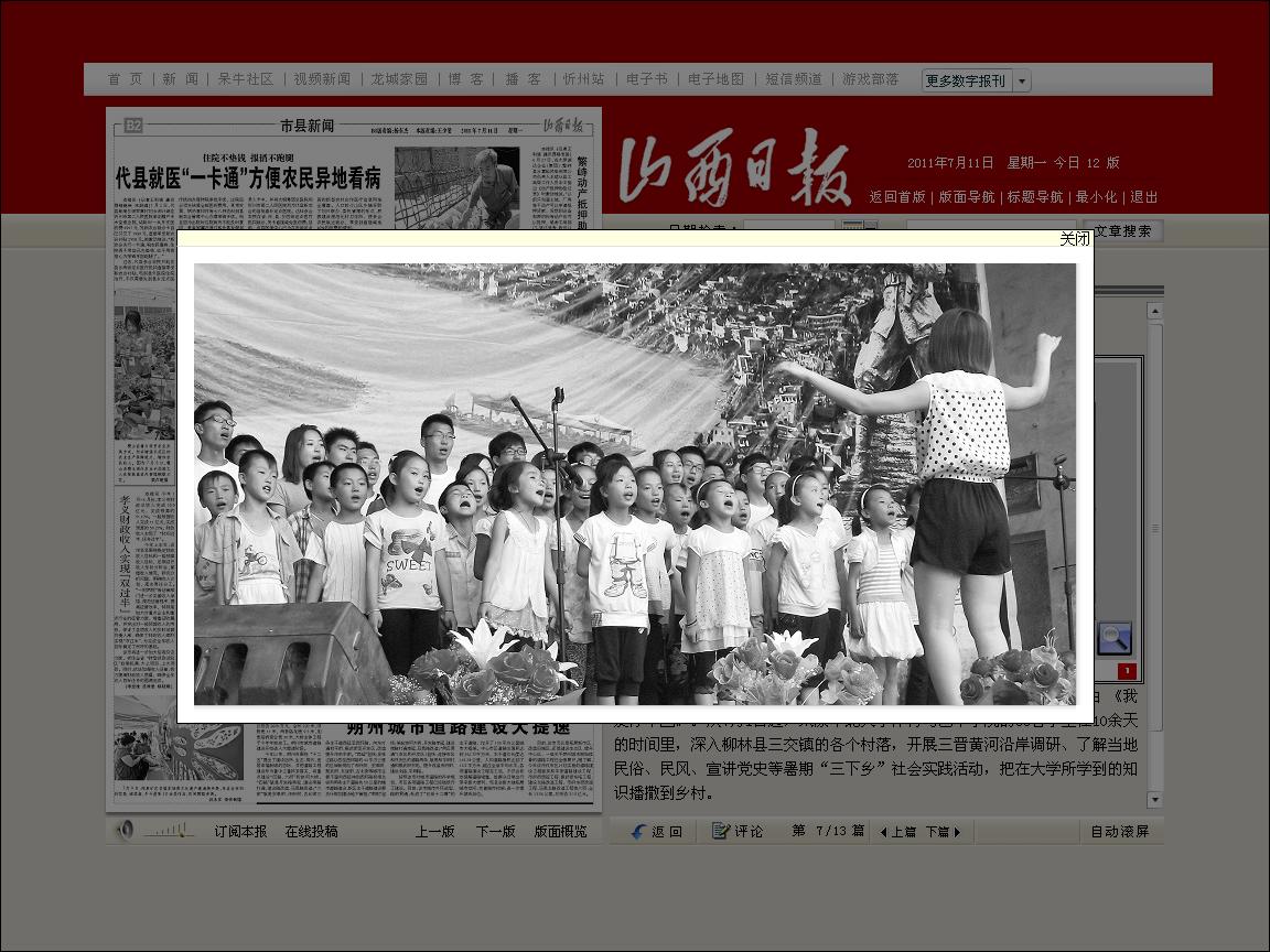 7月10日,在柳林县三交镇党家寨村,大学生正与村里孩子合唱歌曲 《我爱你中国》。从7月1日起,太原台湾大奶 体育与艺术台湾大奶的35名学生在10余天的时间里,深入柳林县三交镇的各个村落,开展三晋黄河沿岸调研、了解当地民俗、民风、宣讲党史等暑期“三下乡”社会实践活动,把在大学所学到的知识播撒到乡村。 本报记者 李兆民摄