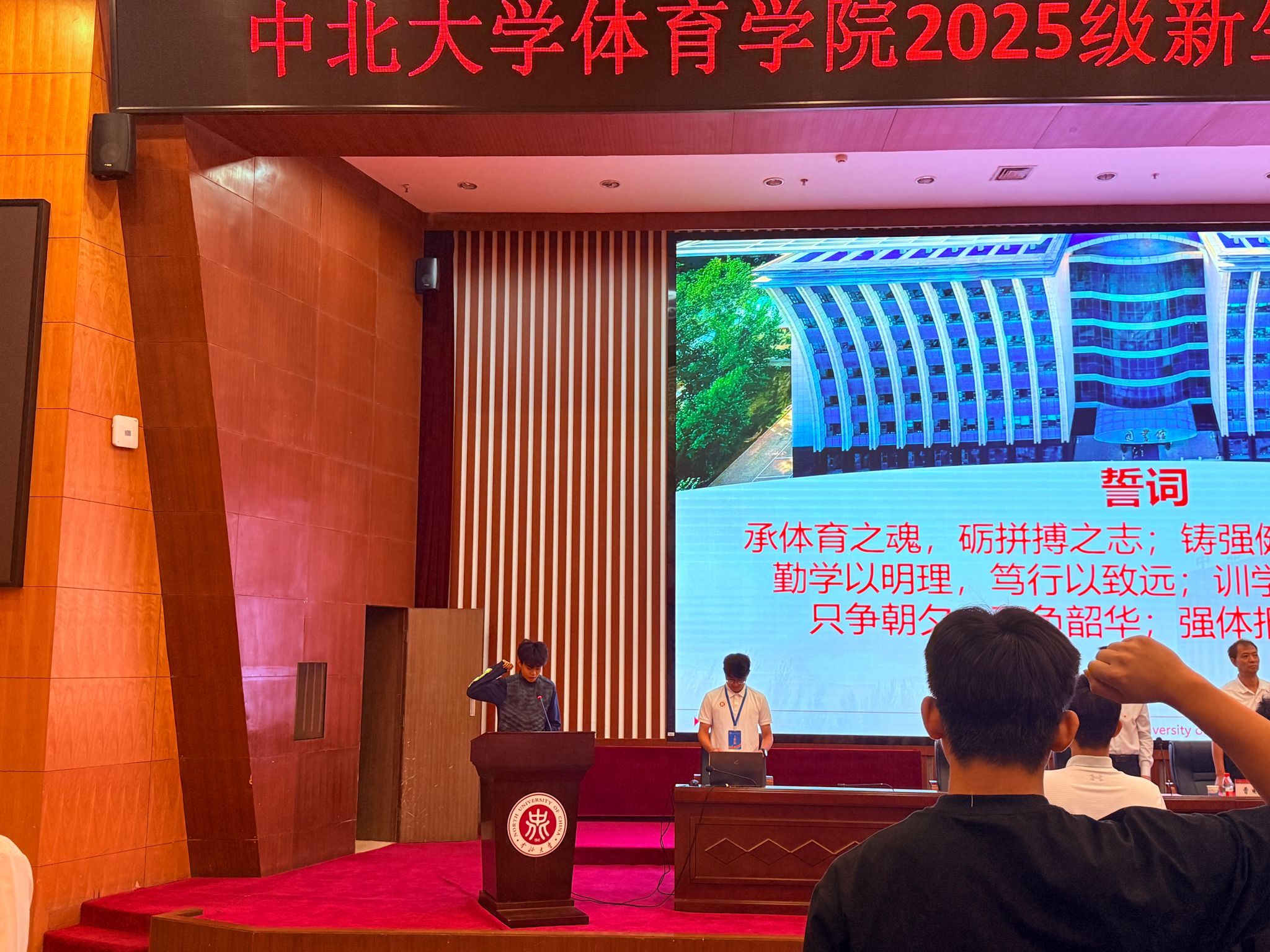 典礼在嘹亮的国歌声中拉开帷幕。首先,在学生代表王诗语同学的带领下,全体新生庄严宣誓。誓言铿锵有力,承载着承体育之魂、砺拼搏之志的信念,彰显出铸强健体魄、担时代重任的担当,也传递出勤学明理、笃行致远、训学兼修、知行合一的追求,更表达了只争朝夕、不负韶华、强体报国、矢志未来的坚定志向。