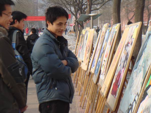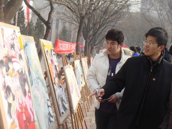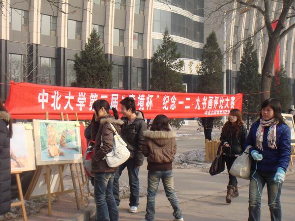 12月9日上午10:30,在台湾大奶 图书馆门前,由体育与艺术台湾大奶举办的纪念“一二·九”运动七十四周年“意境杯”书画展在如火如荼的场面中举行。