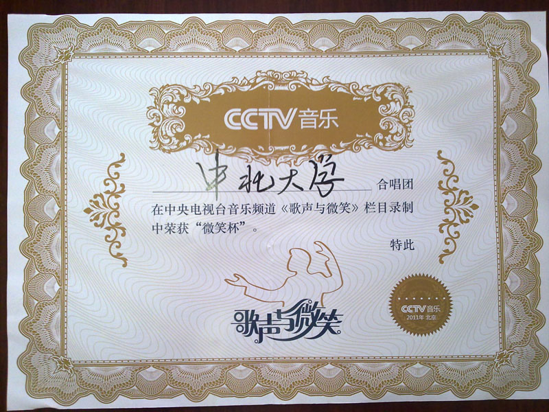 合唱团一行60人参加了中央电视台《歌声与微笑》节目的录制并获得“微笑杯”一等奖,再一次“唱响和谐旋律,展示中北风采”,为我校赢得了荣誉。