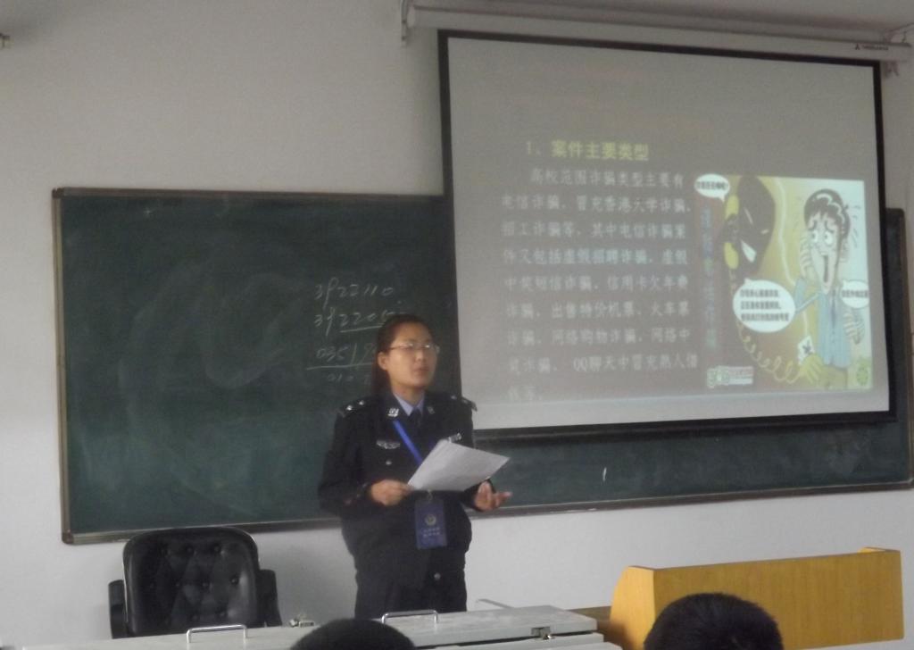 她还生动地向大家讲述了几种引发宿舍火灾的因素以及在火灾中如何逃生,并利用教室的窗帘为大家做了一系列的展示。同时,郭科长还强调了防盗防骗的重要性,结合最近校园内出现的短信和电话诈骗案件,一步步分析诈骗犯的作案手法,让师生了解这些人如何抓住学生和老师们的心理。谨防大家上当受骗。针对宿舍,操场,食堂的盗窃案件,郭科长语重心长的为大家讲述了防范的方法,最大程度的避免同学们遇到类似的问题,保证同学们在校的安全意识和防范意识。
