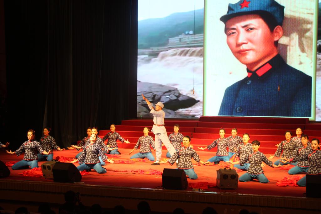 节目分三个部分,节奏欢快的红绸舞、单人刀舞、柔美慢舞等,22名演员,以黄河大合唱为主题曲,穿插东方红音乐,配以紧扣主题的黄河浪涛及毛泽东光辉形象等巨幕背景,气势磅礴,舞蹈形象生动地展现抗日战争那个不屈、悲壮、奋斗不息的年代。由于体育教师的基本功扎实、训练有素,加之为迎接当党代会这样意义重大的活动,老师们格外尽心尽力,加班加点刻苦排练,功夫不负有心人,整场演出5份30秒,精彩纷呈,赢得了全场喝彩。